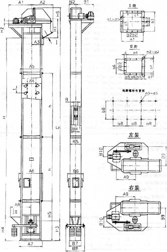 TH型斗提機外形見圖2,其尺寸見表7、驅動裝置配套及相關尺寸見表9。