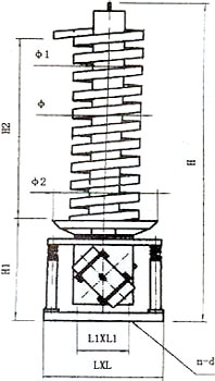 ZC系列垂直振動輸送機(jī)的驅(qū)動裝置振動電機(jī)安裝在輸送塔下部,兩臺振動電機(jī)對稱交叉安裝,輸送塔由管體和焊接在管體周圍的螺旋輸送槽組成,輸送塔座于減振裝置上,減振裝置由底座和隔振彈簧組成。(見圖一)當(dāng)垂直輸送機(jī)工作時,根據(jù)雙振動電機(jī)自同步原理,由振動電機(jī)產(chǎn)生激振力,強(qiáng)迫整個輸送塔體作水平圓運(yùn)動和向上垂直運(yùn)動的空間復(fù)合振動,螺旋槽內(nèi)的物料則受輸送槽的作用,作勻速拋擲圓運(yùn)動,沿輸送槽體向上運(yùn)動,從而完成物料的向上(或向下)輸送作業(yè)。